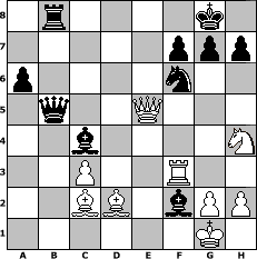 Partie-Notation im PGN-Format [Event "Sommerturnier 2"] [Site "www.mySchach.de"] [Date "2011.07.17"] [Round "1"] [White "muellerh"] [Black "Steffi"] [ECO "A13"] [WhitemyELO "1491"] [BlackmyELO "1556"] [Result "0-1"] [TimeControl "10/1728000"] [WhiteDays "06"] [BlackDays "06"] [MySchachNr "75138"] 1. c4 e6 2. d4 d5 3. Nc3 Nf6 4. Nf3 c6 5. e3 Be7 6. Bd3 O-O 7. O-O Nbd7 8. Re1 dxc4 9. Bxc4 Nd5 10. e4 Nxc3 11. bxc3 b5 12. Bb3 Bb7 13. a4 bxa4 14. Bxa4 a6 15. Rb1 Rb8 16. Bd2 Qc7 17. Re3 Ba8 18. Bc2 e5 19. d5 cxd5 20. exd5 Bxd5 21. Qe2 Bc5 22. Rd3 Qc6 23. Nh4 Bc4 24. Rxb8 Rxb8 25. Qh5 Nf6 26. Qxe5 Qb5 27. Rf3 Bxf2+ 0-1 Stellungs-Notation im FEN-Format 1r4k1/5ppp/p4n2/1q2Q3/2b4N/2P2R2/2BB1bPP/6K1 - - - 0 28 Geschlagene Figuren Weiss: Geschlagene Figuren Schwarz: Klicken Sie auf eine geschlagene Figur um den gewünschten Zug darzustellen!