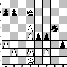 Partie-Notation im PGN-Format [Event "November-Open 1/6"] [Site "www.mySchach.de"] [Date "2007.11.05"] [Round "1"] [White "Chelly"] [Black "nordlicht"] [ECO "A46"] [WhitemyELO "1593"] [BlackmyELO "2028"] [Result "0-1"] [TimeControl "10/1728000"] [WhiteDays "19"] [BlackDays "13"] [MySchachNr "39473"] 1. d4 Nf6 2. Nf3 d5 3. Bf4 Bf5 4. e3 e6 5. Bd3 Bxd3 6. Qxd3 Bd6 7. Bxd6 cxd6 8. Nbd2 Nc6 9. a3 e5 10. dxe5 dxe5 11. Qf5 g6 12. Qg5 h6 13. Qh4 e4 14. Nd4 Nxd4 15. exd4 Rc8 16. c3 Nh5 17. Qxd8+ Kxd8 18. g3 f5 19. O-O-O f4 20. g4 Nf6 21. h3 g5 22. Rdg1 h5 23. gxh5 Rxh5 24. Rg2 Kd7 25. Rhg1 Nh7 26. Rh2 Nf8 27. h4 Ne6 28. Rg4 Rch8 29. c4 Rxh4 30. Rgxh4 Rxh4 31. Rxh4 gxh4 32. cxd5 Ng5 33. Kd1 h3 0-1 Stellungs-Notation im FEN-Format 8/pp1k4/8/3P2n1/3Ppp2/P6p/1P1N1P2/3K4 - - - 0 34 Geschlagene Figuren Weiss: Geschlagene Figuren Schwarz: Klicken Sie auf eine geschlagene Figur um den gewünschten Zug darzustellen!
