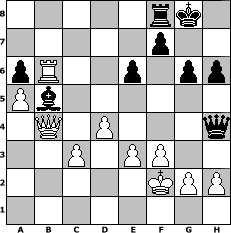 Partie-Notation im PGN-Format [Event "M"] [Site "www.mySchach.de"] [Date "2017.03.24"] [Round "1"] [White "Naunhofer"] [Black "lotchi"] [ECO "D02"] [WhitemyELO "1640"] [BlackmyELO "1209"] [Result "0-1"] [TimeControl "10/1728000"] [WhiteDays "80"] [BlackDays "79"] [MySchachNr "107537"] 1. d4 d5 2. Nf3 Nf6 3. c4 Nc6 4. Nc3 e6 5. e3 Bb4 6. Bd2 Bxc3 7. Bxc3 h6 8. Be2 O-O 9. O-O a6 10. Rc1 Ne4 11. c5 Nxc3 12. bxc3 Qf6 13. a4 Bd7 14. Rb1 Rfb8 15. Qc2 b6 16. cxb6 cxb6 17. Rb2 Na5 18. Rfb1 Nc4 19. Bxc4 dxc4 20. Ne5 Be8 21. Rxb6 Rxb6 22. Rxb6 g6 23. Nxc4 Qe7 24. Qb3 Qd7 25. a5 Qc7 26. Nd6 Bc6 27. Qb4 Rd8 28. Nc4 Bb5 29. Ne5 Qxe5 30. Qe7 Qd5 31. f3 Rf8 32. Qb4 Qg5 33. Kf2 Qh4+ 0-1 Stellungs-Notation im FEN-Format 5rk1/5p2/pR2p1pp/Pb6/1Q1P3q/2P1PP2/5KPP/8 - - - 5 34 Geschlagene Figuren Weiss: Geschlagene Figuren Schwarz: Klicken Sie auf eine geschlagene Figur um den gewünschten Zug darzustellen!