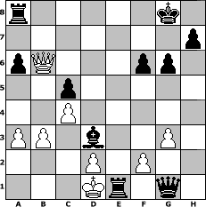 Partie-Notation im PGN-Format [Event "2. HK-Turnier"] [Site "www.mySchach.de"] [Date "2004.08.30"] [Round "2"] [White "Master1"] [Black "Sanji"] [ECO "B20"] [WhitemyELO "1303"] [BlackmyELO "1336"] [Result "0-1"] [TimeControl "10/2592000"] [WhiteDays "30"] [BlackDays "30"] [MySchachNr "6441"] 1. e4 c5 2. c4 d6 3. b3 Nc6 4. Nc3 Nf6 5. Nf3 g6 6. Bd3 Bg7 7. O-O O-O 8. a3 a6 9. Rb1 b6 10. Nd5 e6 11. Nxf6+ Qxf6 12. Bb2 Qe7 13. Bxg7 Kxg7 14. Re1 Bb7 15. Qe2 Rfe8 16. e5 dxe5 17. Nxe5 Nxe5 18. Qxe5+ Kg8 19. Re3 Qh4 20. Be4 f6 21. Qc7 Bxe4 22. g3 Qg4 23. Kf1 Qh3+ 24. Ke1 Bxb1 25. Qxb6 Qxh2 26. Rxe6 Bd3 27. Kd1 Qg1+ 28. Re1 Rxe1# 0-1 Stellungs-Notation im FEN-Format r5k1/7p/pQ3pp1/2p5/2P5/PP1b2P1/3P1P2/3Kr1q1 - - - 0 29 Geschlagene Figuren Weiss: Geschlagene Figuren Schwarz: Klicken Sie auf eine geschlagene Figur um den gewünschten Zug darzustellen!