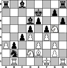 Partie-Notation im PGN-Format [Event "Wrixum - Open die IX"] [Site "www.mySchach.de"] [Date "2011.10.15"] [Round "1"] [White "Tomino"] [Black "Erich"] [ECO "A46"] [WhitemyELO "1768"] [BlackmyELO "1963"] [Result "0-1"] [TimeControl "10/2592000"] [WhiteDays "57"] [BlackDays "90"] [MySchachNr "76858"] 1. d4 Nf6 2. Nf3 e6 3. Bf4 d5 4. e3 c5 5. c3 Nc6 6. Bd3 Nh5 7. Bg3 Qb6 8. Qb3 c4 9. Qxb6 axb6 10. Bc2 b5 11. a3 Nxg3 12. hxg3 f5 13. Nbd2 b4 14. Ke2 b3 15. Bd1 Bd6 16. Ng5 h6 17. f4 b5 18. Kf2 b4 19. cxb4 Nxb4 20. Rb1 Nd3+ 21. Kf1 Ke7 22. Be2 Nxb2 0-1 Stellungs-Notation im FEN-Format r1b4r/4k1p1/3bp2p/3p1pN1/2pP1P2/Pp2P1P1/1n1NB1P1/1R3K1R - - - 0 23 Geschlagene Figuren Weiss: Geschlagene Figuren Schwarz: Klicken Sie auf eine geschlagene Figur um den gewünschten Zug darzustellen!