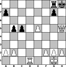 Partie-Notation im PGN-Format [Event "Chess for beginners"] [Site "www.mySchach.de"] [Date "2006.09.27"] [Round "1"] [Board "1"] [White "zoli"] [Black "Master1"] [ECO "D00"] [WhitemyELO "1627"] [BlackmyELO "1902"] [Result "1-0"] [TimeControl "10/2592000"] [WhiteDays "30"] [BlackDays "28"] [MySchachNr "28981"] 1. d4 d5 2. Bf4 Bf5 3. e3 Nf6 4. Nf3 e6 5. Bd3 Bg4 6. Nbd2 Bd6 7. c3 Nc6 8. Qb3 Na5 9. Qa4+ Nc6 10. Ne5 Bxe5 11. Bxe5 O-O 12. O-O Nxe5 13. dxe5 Qd7 14. Bb5 Qe7 15. exf6 Qxf6 16. Qxg4 c6 17. Bd3 e5 18. e4 d4 19. cxd4 b5 20. Nf3 exd4 21. e5 Qh6 22. Nxd4 Rad8 23. Nf5 Qg6 24. Ne7+ Kh8 25. Bxg6 fxg6 26. Rad1 Rxd1 27. Rxd1 c5 28. Nxg6+ hxg6 29. Qxg6 Rg8 30. Qh5# 1-0 Stellungs-Notation im FEN-Format 6rk/p5p1/8/1pp1P2Q/8/8/PP3PPP/3R2K1 - - - 2 30 Geschlagene Figuren Weiss: Geschlagene Figuren Schwarz: Klicken Sie auf eine geschlagene Figur um den gewünschten Zug darzustellen!