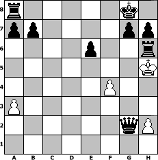 Partie-Notation im PGN-Format [Event "?"] [Site "www.mySchach.de"] [Date "2021.05.07"] [Round "?"] [White "crazy"] [Black "Raipan@"] [ECO "D02"] [WhitemyELO "1310"] [BlackmyELO "1500"] [Result "0-1"] [TimeControl "10/1728000"] [WhiteDays "13"] [BlackDays "20"] [MySchachNr "122176"] 1. d4 d5 2. Nf3 c5 3. g3 c4 4. b3 Nf6 5. Nc3 Bf5 6. Ne5 e6 7. bxc4 Bb4 8. Qd2 Qa5 9. Bb2 O-O 10. a3 Bd6 11. c5 Bxe5 12. dxe5 Ne4 13. Qd4 Nc6 14. Qe3 d4 15. Qf3 dxc3 16. Bc1 Nd4 17. Qd3 Qxc5 18. Rb1 Qxe5 19. Bf4 Qf6 20. Rd1 Nd2 21. e4 Bxe4 22. Qxe4 Nxe4 23. Rxd4 Qxd4 24. Be3 Qa4 25. Bd3 Qc6 26. O-O Nd2 27. Bxd2 cxd2 28. Rd1 Qc3 29. Rxd2 Qxd2 30. Be4 Qe1+ 31. Kg2 Qxe4+ 32. f3 Qxc2+ 33. Kh3 f5 34. f4 Rf6 35. g4 fxg4+ 36. Kxg4 Qg2+ 37. Kh5 Rh6# 0-1 Stellungs-Notation im FEN-Format r5k1/pp4pp/4p2r/7K/5P2/P7/6qP/8 - - - 3 38 Geschlagene Figuren Weiss: Geschlagene Figuren Schwarz: Klicken Sie auf eine geschlagene Figur um den gewünschten Zug darzustellen!