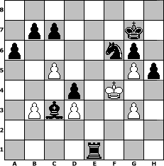 Partie-Notation im PGN-Format [Event "uns Nr. 6"] [Site "www.mySchach.de"] [Date "2012.10.27"] [Round "1"] [White "MiFie"] [Black "Wulfen49"] [ECO "C44"] [WhitemyELO "1093"] [BlackmyELO "1200"] [Result "0-1"] [TimeControl "10/864000"] [WhiteDays "05"] [BlackDays "10"] [MySchachNr "84721"] 1. e4 e5 2. Nf3 Nc6 3. d3 Nf6 4. Bg5 Bd6 5. Be2 O-O 6. Nc3 Be7 7. O-O d6 8. g3 d5 9. b3 d4 10. Nb5 Bd7 11. c4 Ne8 12. Bd2 a6 13. Na3 Bxa3 14. Bg5 f6 15. Bd2 Bb4 16. Bc1 Bc3 17. Rb1 f5 18. Ng5 Nb4 19. Bh5 g6 20. exf5 Ng7 21. Bg4 Nxa2 22. f4 Bxf5 23. fxe5 h5 24. Ba3 Bxg4 25. Rxf8+ Qxf8 26. Bxf8 Bxd1 27. Rxd1 Rxf8 28. e6 Re8 29. h4 Nxe6 30. Rf1 Nxg5 31. hxg5 Nb4 32. Rf3 Re1+ 33. Kf2 Nc2 34. Rf6 Kg7 35. c5 Ne3 36. Kf3 Ng4 37. Kf4 Nxf6 0-1 Stellungs-Notation im FEN-Format 8/1pp3k1/p4np1/2P3Pp/3p1K2/1PbP2P1/8/4r3 - - - 0 38 Geschlagene Figuren Weiss: Geschlagene Figuren Schwarz: Klicken Sie auf eine geschlagene Figur um den gewünschten Zug darzustellen!