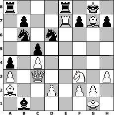 Partie-Notation im PGN-Format [Event "Ein ganz normales"] [Site "www.mySchach.de"] [Date "2007.05.28"] [Round "1"] [White "kischok46"] [Black "Caligula"] [ECO "D11"] [WhitemyELO "1939"] [BlackmyELO "1773"] [Result "1-0"] [TimeControl "10/2592000"] [WhiteDays "90"] [BlackDays "88"] [MySchachNr "35173"] 1. d4 d5 2. c4 c6 3. Nf3 e6 4. e3 Nf6 5. Nc3 Bd6 6. Bd3 Nbd7 7. Qc2 dxc4 8. Bxc4 O-O 9. O-O e5 10. Bb3 Qe7 11. h3 a5 12. a3 Nb6 13. dxe5 Bxe5 14. Re1 Bxc3 15. bxc3 Ne4 16. Bb2 Bf5 17. c4 a4 18. Ba2 c5 19. Rab1 Rfe8 20. Bxg7 Nd6 21. e4 Bxe4 22. Qc3 Bxb1 23. Rxe7 1-0 Stellungs-Notation im FEN-Format r3r1k1/1p2RpBp/1n1n4/2p5/p1P5/P1Q2N1P/B2P1PP1/1b4K1 - - - 0 23 Geschlagene Figuren Weiss: Geschlagene Figuren Schwarz: Klicken Sie auf eine geschlagene Figur um den gewünschten Zug darzustellen!