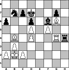 Partie-Notation im PGN-Format [Event "Kleiner Schachwettkampf"] [Site "www.mySchach.de"] [Date "2011.03.28"] [Round "1"] [White "Haki"] [Black "faustballer"] [ECO "C41"] [WhitemyELO "1232"] [BlackmyELO "1530"] [Result "1/2-1/2"] [TimeControl "10/2592000"] [WhiteDays "120"] [BlackDays "119"] [MySchachNr "73068"] 1. e4 e5 2. Nf3 d6 3. g3 Nf6 4. Nc3 Bg4 5. d3 Nc6 6. h3 Bh5 7. Be2 Bg6 8. Nh4 h6 9. Nxg6 fxg6 10. Be3 h5 11. Kd2 Qd7 12. Kc1 Be7 13. Qg1 a6 14. f4 O-O-O 15. Bf3 Rdg8 16. b3 Kd8 17. Kb2 Ke8 18. Rf1 b5 19. Kb1 b4 20. Nd5 Nxd5 21. exd5 Na5 22. Be4 Bf6 23. Bxg6+ Ke7 24. h4 Rf8 25. d4 exf4 26. gxf4 Kd8 27. Bd2 Qg4 28. Qxg4 hxg4 29. Bxb4 Nb7 30. Rfg1 Bxh4 31. Rxg4 Bf6 32. Rxh8 Rxh8 33. f5 Kd7 34. Kb2 Rh4 1/2-1/2 Stellungs-Notation im FEN-Format 8/1npk2p1/p2p1bB1/3P1P2/1B1P2Rr/1P6/PKP5/8 - - - 3 35 Geschlagene Figuren Weiss: Geschlagene Figuren Schwarz: Klicken Sie auf eine geschlagene Figur um den gewünschten Zug darzustellen!
