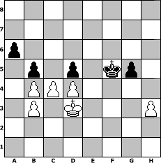 Partie-Notation im PGN-Format [Event "K"] [Site "www.mySchach.de"] [Date "2016.05.02"] [Round "1"] [White "Erich"] [Black "Lohl"] [ECO "C30"] [WhitemyELO "2118"] [BlackmyELO "1705"] [Result "1-0"] [TimeControl "10/3456000"] [WhiteDays "40"] [BlackDays "39"] [MySchachNr "103541"] 1. e4 e5 2. f4 Nf6 3. fxe5 Nxe4 4. Nf3 Ng5 5. d4 Nxf3+ 6. Qxf3 Qh4+ 7. Qf2 Qxf2+ 8. Kxf2 Nc6 9. c3 Be7 10. Bc4 O-O 11. Nd2 d6 12. exd6 cxd6 13. Re1 Rd8 14. Bd5 Re8 15. Kg1 Bd7 16. Nc4 b5 17. Na3 Rab8 18. Bf4 g5 19. Bg3 Rb6 20. Re2 Bf8 21. Rf2 Nd8 22. Raf1 Be6 23. Bb3 Bxb3 24. axb3 h6 25. b4 Kh7 26. h3 Re3 27. Bh2 Bg7 28. Rf5 a6 29. Nc2 Re2 30. R1f2 Re8 31. R5f3 Kg6 32. Ne3 Nc6 33. Nf5 Re1+ 34. Rf1 Rxf1+ 35. Rxf1 Bf8 36. g4 f6 37. Kg2 d5 38. Re1 Kf7 39. Bc7 Rb7 40. Bd6 Ne7 41. Bxe7 Bxe7 42. Nxh6+ Kg7 43. Nf5+ Kf7 44. Nxe7 Rxe7 45. Rxe7+ Kxe7 46. Kg3 Kf7 47. Kf3 Kg6 48. b3 Kf7 49. Ke3 Ke6 50. Kd3 f5 51. gxf5+ Kxf5 52. c4 1-0 Stellungs-Notation im FEN-Format 8/8/p7/1p1p1kp1/1PPP4/1P1K3P/8/8 - - - 0 52 Geschlagene Figuren Weiss: Geschlagene Figuren Schwarz: Klicken Sie auf eine geschlagene Figur um den gewünschten Zug darzustellen!