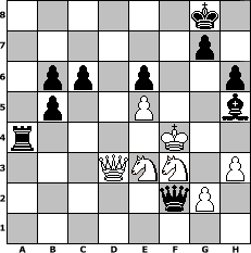 Partie-Notation im PGN-Format [Event "Herbstturnier 2022"] [Site "www.mySchach.de"] [Date "2022.09.26"] [Round "2"] [White "beowulf"] [Black "MiFie"] [ECO "A02"] [WhitemyELO "1508"] [BlackmyELO "1087"] [Result "0-1"] [TimeControl "10/1728000"] [WhiteDays "100"] [BlackDays "079"] [MySchachNr "127315"] 1. f4 f5 2. Nf3 e6 3. e3 Nc6 4. Bb5 a6 5. Bxc6 dxc6 6. O-O Nf6 7. Nc3 Bd6 8. d3 O-O 9. h3 h6 10. Ne5 Bc5 11. Qe2 Nd5 12. d4 Bd6 13. Ng6 Rf6 14. Qh5 Nb4 15. Bd2 Nxc2 16. Rac1 Nb4 17. e4 Nd3 18. e5 Rf7 19. Rc2 Nb4 20. Rcc1 Nd3 21. Rc2 Nb4 22. Rcc1 Nd3 23. Rb1 Bb4 24. Qe2 Qxd4+ 25. Kh1 b5 26. a3 Ba5 27. b4 Bb6 28. Rb3 a5 29. Nd1 Rd7 30. Be3 Qd5 31. Rc3 axb4 32. axb4 Nxb4 33. Bxb6 cxb6 34. Ne3 Qd4 35. Rd1 Qxc3 36. Rxd7 Bxd7 37. Kh2 Be8 38. Nh4 Ra2 39. Qf3 Qc1 40. Qg3 Ra1 41. Qf2 Nd3 42. Qe2 Nxf4 43. Qf2 Nd3 44. Qe2 Qg1+ 45. Kg3 Bh5 46. Qxd3 f4+ 47. Kxf4 Qf2+ 48. Nf3 Ra4+ 0-1 Stellungs-Notation im FEN-Format 6k1/6p1/1pp1p2p/1p2P2b/r4K2/3QNN1P/5qP1/8 - - - 3 49 Geschlagene Figuren Weiss: Geschlagene Figuren Schwarz: Klicken Sie auf eine geschlagene Figur um den gewünschten Zug darzustellen!