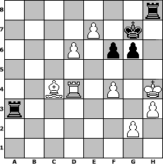 Partie-Notation im PGN-Format [Event "U15 Turnier"] [Site "www.mySchach.de"] [Date "2010.02.07"] [Round "1"] [Board "1"] [White "73DADDELDU37"] [Black "Andylein1989"] [ECO "A10"] [WhitemyELO "1470"] [BlackmyELO "1486"] [Result "0-1"] [TimeControl "10/2592000"] [WhiteDays "30"] [BlackDays "30"] [MySchachNr "62973"] 1. c4 g6 2. d4 Bg7 3. e4 d6 4. Nf3 Bg4 5. Be2 Nd7 6. Nc3 Bxf3 7. Bxf3 c6 8. O-O Ngf6 9. d5 cxd5 10. cxd5 O-O 11. Bf4 Qb6 12. Rb1 Nc5 13. Na4 Nxa4 14. Qxa4 Rac8 15. Be3 Qc7 16. a3 a6 17. Bg5 Nd7 18. Bxe7 Rfe8 19. Rbc1 Qxc1 20. Qxd7 Qc7 21. Qxc7 Rxc7 22. Bxd6 Rc2 23. b4 Rc3 24. h3 Be5 25. Bxe5 Rxe5 26. Rd1 Rxa3 27. d6 Re8 28. e5 Rd8 29. Bxb7 Rb3 30. Bxa6 Rxb4 31. f3 Ra4 32. Bb5 Ra5 33. Rd5 Kf8 34. f4 h5 35. Kf2 h4 36. Kf3 Ra3+ 37. Ke4 Rg3 38. Rd2 Rb3 39. Ba4 Rb4+ 40. Rd4 Rb2 41. Kf3 Ra2 42. Bc6 Ra3+ 43. Kg4 Ra6 44. Be4 f6 45. Kxh4 Kf7 46. Bd3 Ra5 47. Bc4+ Kg7 48. e6 Ra3 49. e7 Rh8+ 0-1 Stellungs-Notation im FEN-Format 7r/4P1k1/3P1pp1/8/2BR1P1K/r6P/6P1/8 - - - 1 50 Geschlagene Figuren Weiss: Geschlagene Figuren Schwarz: Klicken Sie auf eine geschlagene Figur um den gewünschten Zug darzustellen!