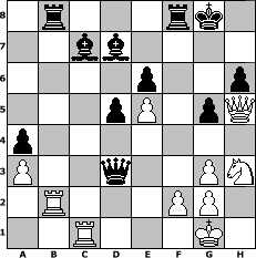 Partie-Notation im PGN-Format [Event "Ferien-Turnier"] [Site "www.mySchach.de"] [Date "2005.07.23"] [Round "1"] [White "Juliette2103"] [Black "OwainGwynedd"] [ECO "C02"] [WhitemyELO "1971"] [BlackmyELO "1234"] [Result "1/2-1/2"] [TimeControl "10/2592000"] [WhiteDays "90"] [BlackDays "23"] [MySchachNr "15367"] 1. e4 e6 2. d4 d5 3. e5 c5 4. c3 Nc6 5. Nf3 Qb6 6. a3 cxd4 7. cxd4 Nge7 8. Nc3 Nf5 9. Na4 Qd8 10. Be2 Be7 11. b4 O-O 12. O-O a6 13. Bf4 f6 14. Bd3 fxe5 15. Bxe5 b6 16. Re1 Bd7 17. Nc3 a5 18. bxa5 bxa5 19. Bg3 Nxg3 20. hxg3 Qe8 21. Ne2 Bd6 22. Nc3 Be7 23. Ne2 Bd6 24. Qd2 Qh5 25. Ng5 h6 26. Nf3 Rab8 27. Nf4 Qg4 28. Ne5 Nxe5 29. dxe5 Bc5 30. Rec1 Bb6 31. Rab1 g5 32. Nh3 a4 33. Rb2 Qd4 34. Qe2 Bc7 35. Qh5 Qxd3 1/2-1/2 Stellungs-Notation im FEN-Format 1r3rk1/2bb4/4p2p/3pP1pQ/p7/P2q2PN/1R3PP1/2R3K1 - - - 0 36 Geschlagene Figuren Weiss: Geschlagene Figuren Schwarz: Klicken Sie auf eine geschlagene Figur um den gewünschten Zug darzustellen!