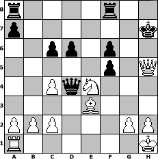 Partie-Notation im PGN-Format [Event "LISA OPEN #2"] [Site "www.mySchach.de"] [Date "2017.10.26"] [Round "1"] [White "lisama"] [Black "wolni55"] [ECO "A30"] [WhitemyELO "1584"] [BlackmyELO "1396"] [Result "1-0"] [TimeControl "10/3456000"] [WhiteDays "40"] [BlackDays "40"] [MySchachNr "110151"] 1. c4 c5 2. e3 e5 3. Nf3 d6 4. Nc3 Nf6 5. d4 cxd4 6. exd4 e4 7. Nd2 Bf5 8. Be2 h6 9. O-O Be7 10. f3 exf3 11. Bxf3 Nc6 12. Bxc6+ bxc6 13. Rxf5 Qb6 14. Nde4 O-O 15. Nxf6+ Bxf6 16. Rxf6 gxf6 17. Bxh6 f5 18. Ne4 f6 19. Qh5 Qxd4+ 20. Kh1 Kh7 21. Be3+ 1-0 Stellungs-Notation im FEN-Format r4r2/p6k/2pp1p2/5p1Q/2PqN3/4B3/PPP3PP/R6K - - - 3 21 Geschlagene Figuren Weiss: Geschlagene Figuren Schwarz: Klicken Sie auf eine geschlagene Figur um den gewünschten Zug darzustellen!