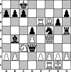 Partie-Notation im PGN-Format [Event "Sommerturnier 2"] [Site "www.mySchach.de"] [Date "2011.07.17"] [Round "1"] [White "Ziegert"] [Black "reisinger"] [ECO "C16"] [WhitemyELO "1500"] [BlackmyELO "1464"] [Result "1-0"] [TimeControl "10/1728000"] [WhiteDays "12"] [BlackDays "20"] [MySchachNr "75112"] 1. e4 e6 2. d4 d5 3. Nc3 Bb4 4. e5 f6 5. Qg4 g6 6. Nf3 Nd7 7. Bd3 Ne7 8. Qxe6 Nxe5 9. Qxf6 Nxd3+ 10. cxd3 Rf8 11. Qg5 Be6 12. O-O Qd7 13. Ne5 Qd6 14. Bf4 O-O-O 15. Nb5 Qa6 16. Nc3 Rf5 17. Qg3 Rdf8 18. Bh6 R8f6 19. Bg7 Rxe5 20. Bxf6 Rh5 21. Rae1 Nf5 22. Qf4 Qxd3 23. Rxe6 1-0 Stellungs-Notation im FEN-Format 2k5/ppp4p/4RBp1/3p1n1r/1b1P1Q2/2Nq4/PP2PPPP/5RK1 - - - 0 23 Geschlagene Figuren Weiss: Geschlagene Figuren Schwarz: Klicken Sie auf eine geschlagene Figur um den gewünschten Zug darzustellen!