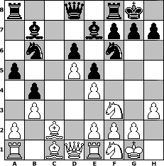 Partie-Notation im PGN-Format [Event "Schach dem Osterhasen IV"] [Site "www.mySchach.de"] [Date "2015.03.29"] [Round "1"] [White "Ziegert"] [Black "Caligula"] [ECO "C62"] [WhitemyELO "1364"] [BlackmyELO "1385"] [Result "0-1"] [TimeControl "10/2592000"] [WhiteDays "00"] [BlackDays "48"] [MySchachNr "98718"] 1. e4 e5 2. Nf3 Nc6 3. Bb5 d6 4. O-O Bd7 5. c3 Nf6 6. Re1 a6 7. Ba4 b5 8. Bb3 Na5 9. Bc2 c5 10. d4 cxd4 11. cxd4 Bc6 12. d5 Bb7 13. Nc3 Be7 14. h3 b4 15. Nb1 Nc4 16. b3 Nb6 17. Nbd2 O-O 18. Nf1 a5 0-1 Stellungs-Notation im FEN-Format r2q1rk1/1b2bppp/1n1p1n2/p2Pp3/1p2P3/1P3N1P/P1B1PPP1/R1BQRNK1 - - - 0 19 Geschlagene Figuren Weiss: Geschlagene Figuren Schwarz: Klicken Sie auf eine geschlagene Figur um den gewünschten Zug darzustellen!