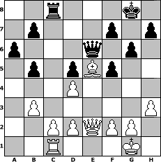 Partie-Notation im PGN-Format [Event "Herbstopen"] [Site "www.mySchach.de"] [Date "2008.09.26"] [Round "1"] [White "Master1"] [Black "alpacino"] [ECO "D02"] [WhitemyELO "1255"] [BlackmyELO "1315"] [Result "1/2-1/2"] [TimeControl "10/864000"] [WhiteDays "21"] [BlackDays "29"] [MySchachNr "48432"] 1. d4 d5 2. Nf3 e6 3. Nc3 Bd6 4. e4 c6 5. e5 Bd7 6. Be2 Ne7 7. exd6 Nc8 8. Ne5 Nxd6 9. Nxd7 Nxd7 10. Bf4 Nf5 11. O-O O-O 12. Bd3 a6 13. Bxf5 exf5 14. Re1 Re8 15. Rxe8+ Qxe8 16. a3 Nb6 17. Bc7 Nc4 18. Rb1 Rc8 19. Bf4 g6 20. b3 Nxa3 21. Ra1 Nb5 22. Nxb5 cxb5 23. Be5 Qe7 24. Rc1 Rc6 25. Qe2 Qe6 26. h3 Rc8 1/2-1/2 Stellungs-Notation im FEN-Format 2r3k1/1p3p1p/p3q1p1/1p1pBp2/3P4/1P5P/2PPQPP1/2R3K1 - - - 1 27 Geschlagene Figuren Weiss: Geschlagene Figuren Schwarz: Klicken Sie auf eine geschlagene Figur um den gewünschten Zug darzustellen!