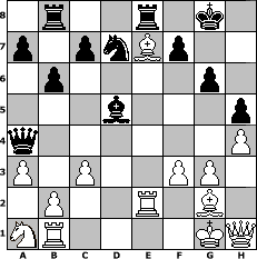 Partie-Notation im PGN-Format [Event "1.FC 960-Clubturnier 2012"] [Site "www.mySchach.de"] [Date "2012.01.07"] [Round "1"] [White "nyffhans"] [Black "Peterlie77 (C)"] [Variant "Fischerrandom"] [SetUp "1"] [FEN "nrbnkbrq/pppppppp/8/8/8/8/PPPPPPPP/NRBNKBRQ w KQkq - 0 1"] [WhitemyELO "1953"] [BlackmyELO "1992"] [Result "1/2-1/2"] [TimeControl "10/2592000"] [WhiteDays "24"] [BlackDays "28"] [MySchachNr "79020"] 1. Nb3 Nb6 2. g3 g6 3. Bg2 Bg7 4. c3 d6 5. d4 Bd7 6. Ne3 e5 7. dxe5 Bxe5 8. O-O O-O 9. Na5 Bc8 10. h4 h5 11. Nac4 Nxc4 12. Nxc4 Re8 13. Nxe5 Qxe5 14. Re1 Qb5 15. Bg5 Nc6 16. Bf1 Ne5 17. e4 Qc6 18. Bg2 Qa4 19. a3 b6 20. f3 Bb7 21. Re2 d5 22. exd5 Bxd5 23. Bf6 Nd7 24. Be7 1/2-1/2 Stellungs-Notation im FEN-Format 1r2r1k1/p1pnBp2/1p4p1/3b3p/q6P/P1P2PP1/1P2R1B1/NR4KQ - - - 3 24 Geschlagene Figuren Weiss: Geschlagene Figuren Schwarz: Klicken Sie auf eine geschlagene Figur um den gewünschten Zug darzustellen!