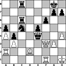 Partie-Notation im PGN-Format [Event "Ying Yang Twins"] [Site "www.mySchach.de"] [Date "2006.06.11"] [Round "1"] [White "FreshPrinc2"] [Black "nogumo"] [Variant "Fischerrandom"] [SetUp "1"] [FEN "rnbqkbrn/pppppppp/8/8/8/8/PPPPPPPP/RNBQKBRN w KQkq - 0 1"] [WhitemyELO "1652"] [BlackmyELO "1830"] [Result "0-1"] [TimeControl "10/864000"] [WhiteDays "00"] [BlackDays "10"] [MySchachNr "26074"] 1. e4 Ng6 2. Nc3 e6 3. Ng3 c5 4. Bc4 a6 5. d4 b5 6. Bd3 cxd4 7. Nce2 e5 8. Bd2 Nc6 9. a4 b4 10. Nf5 a5 11. b3 Be7 12. O-O O-O 13. Bc4 Ba6 14. Bxa6 Rxa6 15. Nxe7+ Ncxe7 16. f3 d5 17. Ng3 dxe4 18. fxe4 Nc8 19. Nf5 Nd6 20. Qe2 Rc6 21. Qd3 Qc7 22. Nxd6 Qxd6 23. g3 Rfc8 24. Ra2 Qc7 25. Rc1 Nf8 26. Bg5 Qb6 27. Qf3 Ne6 28. Bd2 f6 29. Kh1 Qc7 30. h4 Nc5 31. Rf1 Qd7 32. Qg2 d3 33. cxd3 Qxd3 34. Qf3 Qxe4 0-1 Stellungs-Notation im FEN-Format 2r3k1/6pp/2r2p2/p1n1p3/Pp2q2P/1P3QP1/R2B4/5R1K - - - 0 35 Geschlagene Figuren Weiss: ![]() ![]() ![]() ![]() ![]() ![]() ![]() ![]() ![]() ![]() ![]() ![]() ![]() ![]() ![]() Geschlagene Figuren Schwarz: ![]() ![]() ![]() ![]() ![]() ![]() ![]() ![]() ![]() ![]() ![]() ![]() ![]() ![]() ![]() Klicken Sie auf eine geschlagene Figur um den gewünschten Zug darzustellen!