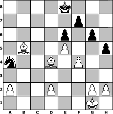 game notation in PGN-format [Event "unter uns Nr. 46 (Frühling 2020)"] [Site "www.myChess.de"] [Date "2020.02.22"] [Round "1"] [White "Gauss1233"] [Black "wolni55"] [ECO "D20"] [WhitemyELO "1476"] [BlackmyELO "1368"] [Result "1-0"] [TimeControl "10/864000"] [WhiteDays "38"] [BlackDays "36"] [MyChessNo "117332"] 1. d4 d5 2. c4 dxc4 3. Nc3 Bf5 4. e4 Bg6 5. Bxc4 h6 6. Nf3 e6 7. O-O a6 8. Re1 Bb4 9. Ne5 Bh7 10. Qa4+ c6 11. Qxb4 Qxd4 12. Qxb7 Qa7 13. Qxa7 Rxa7 14. Be3 Rb7 15. Nd3 Nf6 16. f3 O-O 17. e5 Nfd7 18. f4 Bxd3 19. Bxd3 Rxb2 20. Reb1 Rxb1+ 21. Rxb1 c5 22. Na4 Rc8 23. Rc1 g6 24. Nxc5 Nxc5 25. Bxc5 Nd7 26. Be3 Rxc1+ 27. Bxc1 Nc5 28. Be2 h5 29. Be3 Na4 30. Bxa6 Kf8 31. Bd4 Ke8 32. Bb5+ 1-0 position notation in FEN-format 4k3/5p2/4p1p1/1B2P2p/n2B1P2/8/P2P2PP/6K1 - - - 4 32 Captured white pieces: Captured black pieces: Click on a captured piece in order to display the desired move!