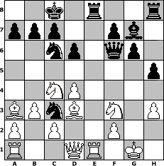 game notation in PGN-format [Event "Fruehjahr 2009"] [Site "www.myChess.de"] [Date "2009.03.12"] [Round "2"] [White "wiesel"] [Black "jeremyt"] [ECO "A40"] [WhitemyELO "1409"] [BlackmyELO "1787"] [Result "0-1"] [TimeControl "10/2592000"] [WhiteDays "52"] [BlackDays "54"] [MyChessNo "53559"] 1. d4 g6 2. b3 Bg7 3. Bb2 d6 4. e3 Nf6 5. Bd3 Nc6 6. Nf3 e5 7. Bb5 exd4 8. exd4 Qe7+ 9. Be2 Bg4 10. Nbd2 O-O-O 11. O-O Nd5 12. h3 Bf5 13. Nc4 Rde8 14. Re1 Qf6 15. Ba3 h5 16. Bd3 Bxh3 17. gxh3 Nc3 0-1 position notation in FEN-format 2k1r2r/ppp2pb1/2np1qp1/7p/2NP4/BPnB1N1P/P1P2P2/R2QR1K1 - - - 1 18 Captured white pieces: Captured black pieces: Click on a captured piece in order to display the desired move!