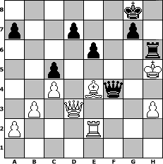 game notation in PGN-format [Event "Enero 2011"] [Site "www.myChess.de"] [Date "2011.01.30"] [Round "1"] [White "Joschi"] [Black "muetoe"] [ECO "B32"] [WhitemyELO "1452"] [BlackmyELO "1839"] [Result "0-1"] [TimeControl "10/3456000"] [WhiteDays "184"] [BlackDays "109"] [MyChessNo "71610"] 1. e4 c5 2. Nf3 Nc6 3. d4 cxd4 4. Nxd4 e6 5. c4 Nf6 6. Nxc6 bxc6 7. Bd3 Bd6 8. O-O O-O 9. Re1 Qc7 10. g3 Be5 11. Qc2 Ba6 12. Be3 Ng4 13. Nc3 Rfb8 14. b3 Nxe3 15. Rxe3 Bd4 16. Re2 h5 17. Rae1 Qe5 18. Nb1 h4 19. Kg2 Rd8 20. Nd2 Qh5 21. h3 hxg3 22. fxg3 Bb7 23. Nf3 c5 24. g4 Qg6 25. e5 f5 26. exf6 Bxf3+ 27. Kxf3 Qxf6+ 28. Kg2 Rf8 29. Be4 Rad8 30. Qd1 Qh6 31. Rf1 Rxf1 32. Qxf1 Rf8 33. Qe1 Qf4 34. Qd2 Qf1+ 35. Kg3 Be5+ 36. Kh4 Bf4 37. Qd3 Rf6 38. g5 Bxg5+ 39. Kxg5 Qf4+ 40. Kh5 Rh6# 0-1 position notation in FEN-format 6k1/p2p2p1/4p2r/2p4K/2P1Bq2/1P1Q3P/P3R3/8 - - - 3 41 Captured white pieces: Captured black pieces: Click on a captured piece in order to display the desired move!