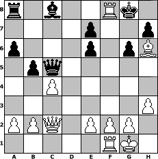 game notation in PGN-format [Event "Turnier f"] [Site "www.myChess.de"] [Date "2009.02.28"] [Round "1"] [White "Andylein1989"] [Black "Ostseeboy"] [ECO "B06"] [WhitemyELO "1638"] [BlackmyELO "1266"] [Result "1-0"] [TimeControl "10/864000"] [WhiteDays "10"] [BlackDays "10"] [MyChessNo "53110"] 1. e4 g6 2. d4 Bg7 3. c4 Nf6 4. Nc3 O-O 5. Nf3 d6 6. Bd3 Nc6 7. h3 a6 8. e5 dxe5 9. dxe5 Nd7 10. e6 fxe6 11. Qc2 Nd4 12. Nxd4 Bxd4 13. O-O Ne5 14. Bh6 Rf7 15. Rad1 Nxd3 16. Rxd3 c5 17. Ne4 b5 18. Nxc5 Qc7 19. Rxd4 Qxc5 20. Rd8+ Rf8 21. Rxf8# 1-0 position notation in FEN-format r1b2Rk1/4p2p/p3p1pB/1pq5/2P5/7P/PPQ1PPP1/5RK1 - - - 0 21 Captured white pieces: Captured black pieces: Click on a captured piece in order to display the desired move!