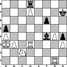 game notation in PGN-format [Event "FairnessTunier"] [Site "www.myChess.de"] [Date "2005.08.24"] [Round "1"] [White "Caligula"] [Black "Knight"] [ECO "A46"] [WhitemyELO "1393"] [BlackmyELO "1525"] [Result "1-0"] [TimeControl "10/2592000"] [WhiteDays "30"] [BlackDays "30"] [MyChessNo "16671"] 1. d4 Nf6 2. Nf3 d5 3. Bg5 Nc6 4. Bxf6 gxf6 5. h3 Bg7 6. e3 e5 7. Bb5 e4 8. Bxc6+ bxc6 9. Nfd2 Ba6 10. Nb3 O-O 11. Nc5 Qc8 12. Qd2 f5 13. Qa5 Bb7 14. O-O Bf6 15. Nd2 Kh8 16. c4 Rg8 17. Nxb7 Qxb7 18. Qc3 Qc8 19. g3 f4 20. Kh2 fxg3+ 21. fxg3 Qe6 22. Rg1 Rg5 23. Nf1 Rh5 24. g4 Rg5 25. b3 h5 26. cxd5 Qxd5 27. Qe1 Qd6+ 28. Qg3 Qxg3+ 29. Kxg3 c5 30. Rd1 cxd4 31. Kf4 h4 32. Kxe4 Re5+ 33. Kf4 Rae8 34. exd4 Bg5+ 35. Kf3 Re2 36. a4 Rb2 37. Rd3 Rd8 38. d5 c5 39. Ke4 Re8+ 40. Kf5 f6 41. d6 Kh7 42. d7 Rd8 43. Ke6 Re2+ 44. Kd6 Bf4+ 45. Kxc5 Rc2+ 46. Kb5 Bc7 47. Ne3 a6+ 48. Kb4 a5+ 49. Ka3 Bf4 50. Nxc2 1-0 position notation in FEN-format 3r4/3P3k/5p2/p7/P4bPp/KP1R3P/2N5/6R1 - - - 0 50 Captured white pieces: Captured black pieces: Click on a captured piece in order to display the desired move!