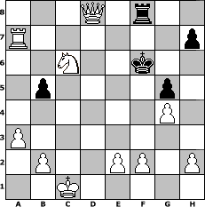 game notation in PGN-format [Event "Alapin-Diemer-Gambit Thematurnier"] [Site "www.myChess.de"] [Date "2010.01.23"] [Round "1"] [White "martinus"] [Black "Lemmi11"] [ECO "C01"] [WhitemyELO "1744"] [BlackmyELO "1554"] [Result "1-0"] [TimeControl "10/2592000"] [WhiteDays "113"] [BlackDays "120"] [MyChessNo "62562"] 1. e4 e6 2. d4 d5 3. Be3 dxe4 4. Nc3 Bb4 5. Qg4 g6 6. Qxe4 Nc6 7. Nf3 Nf6 8. Qh4 Be7 9. Bg5 Nd5 10. Bxe7 Qxe7 11. Qxe7+ Ncxe7 12. Ne4 b6 13. O-O-O Bb7 14. Bb5+ Kf8 15. Rhe1 Nf5 16. c4 Nb4 17. a3 Nc6 18. d5 exd5 19. cxd5 Nce7 20. d6 Nc6 21. d7 Kg7 22. g4 Nd6 23. Nxd6 cxd6 24. Rxd6 a6 25. Bxc6 Bxc6 26. Rxc6 b5 27. Re7 Rhd8 28. Ne5 Kf8 29. Rxf7+ Kg8 30. Re6 Rf8 31. Ree7 Rxf7 32. Rxf7 g5 33. Rf6 Kg7 34. Rxa6 Rd8 35. Ra7 Kf6 36. Nc6 Rf8 37. d8=Q+ 1-0 position notation in FEN-format 3Q1r2/R6p/2N2k2/1p4p1/6P1/P7/1P2PP1P/2K5 - - - 0 37 Captured white pieces: Captured black pieces: Click on a captured piece in order to display the desired move!