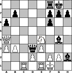 game notation in PGN-format [Event "Spa"] [Site "www.myChess.de"] [Date "2010.02.08"] [Round "1"] [White "Master1"] [Black "gunni50"] [ECO "D02"] [WhitemyELO "1191"] [BlackmyELO "1300"] [Result "0-1"] [TimeControl "10/2592000"] [WhiteDays "30"] [BlackDays "30"] [MyChessNo "63196"] 1. d4 d5 2. Nf3 Nc6 3. Nc3 Nf6 4. Bg5 Be6 5. e3 Qd7 6. Bb5 a6 7. Bxf6 exf6 8. Bxc6 Qxc6 9. O-O Bd6 10. a3 O-O 11. h3 Qd7 12. Re1 c5 13. b3 cxd4 14. Nxd4 Bxh3 15. Qf3 Bg4 16. Qxd5 Rac8 17. Qa5 Rc5 18. Qa4 Qc7 19. Ne4 Bh2+ 20. Kf1 Rxc2 21. Nxc2 Qxc2 22. Rac1 Qd3+ 0-1 position notation in FEN-format 5rk1/1p3ppp/p4p2/8/Q3N1b1/PP1qP3/3P1PPb/2R1RK2 - - - 2 23 Captured white pieces: Captured black pieces: Click on a captured piece in order to display the desired move!