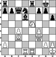 game notation in PGN-format [Event "fr"] [Site "www.myChess.de"] [Date "2011.10.14"] [Round "1"] [White "martinus"] [Black "deepsabel"] [ECO "D02"] [WhitemyELO "1751"] [BlackmyELO "2010"] [Result "1/2-1/2"] [TimeControl "10/1728000"] [WhiteDays "20"] [BlackDays "17"] [MyChessNo "76815"] 1. d4 d5 2. Nf3 Nf6 3. c4 e6 4. Nc3 Nbd7 5. cxd5 exd5 6. Bg5 c6 7. e4 dxe4 8. Nxe4 Be7 9. Nxf6+ Nxf6 10. Bc4 O-O 11. O-O h6 12. Bd2 Bf5 13. Re1 Be4 14. Qe2 Re8 15. Ne5 Bd5 16. b3 Bd6 17. Rad1 Qc7 18. f4 Bxc4 19. bxc4 c5 20. dxc5 Bxc5+ 21. Kh1 Bd6 22. Bc3 Nd7 23. Qf3 1/2-1/2 position notation in FEN-format r3r1k1/ppqn1pp1/3b3p/4N3/2P2P2/2B2Q2/P5PP/3RR2K - - - 5 23 Captured white pieces: ![]() ![]() ![]() ![]() ![]() ![]() ![]() ![]() ![]() ![]() ![]() ![]() ![]() ![]() ![]() Captured black pieces: ![]() ![]() ![]() ![]() ![]() ![]() ![]() ![]() ![]() ![]() ![]() ![]() ![]() ![]() ![]() Click on a captured piece in order to display the desired move!