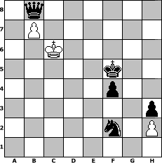 | game notation in PGN-format [Event "Wrixum - Open die XIII"] [Site "www.myChess.de"] [Date "2016.09.28"] [Round "1"] [White "Joschi"] [Black "Grubengeist"] [ECO "B08"] [WhitemyELO "1573"] [BlackmyELO "1933"] [Result "0-1"] [TimeControl "10/2592000"] [WhiteDays "30"] [BlackDays "30"] [MyChessNo "105057"] 1. e4 d6 2. d4 Nf6 3. Nc3 g6 4. Nf3 Bg7 5. Bc4 Nxe4 6. Nxe4 d5 7. Bxd5 Qxd5 8. Nc3 Qc4 9. Qe2 Be6 10. Be3 Nc6 11. Qxc4 Bxc4 12. b3 Ba6 13. O-O-O O-O-O 14. Ne4 Be2 15. Rd2 Bxf3 16. gxf3 Bxd4 17. Bxd4 Nxd4 18. f4 h6 19. Rhd1 Ne6 20. f5 Nf4 21. fxg6 Rxd2 22. Rxd2 Nxg6 23. c4 f5 24. Ng3 e6 25. Re2 Kd7 26. Kc2 h5 27. Kc3 h4 28. Nf1 Nf4 29. Rd2+ Ke7 30. Ne3 Rd8 31. Rxd8 Kxd8 32. Kd4 Ke7 33. Nc2 Ne2+ 34. Ke5 Nc1 35. Na3 a6 36. Nc2 Nd3+ 37. Kd4 Nxf2 38. Ne3 Kf6 39. Ng2 e5+ 40. Kd5 h3 41. Ne3 f4 42. Nf1 Kf5 43. b4 c6+ 44. Kd6 e4 45. Kc7 e3 46. Kxb7 e2 47. Nd2 e1=Q 48. Kxc6 Qxd2 49. b5 axb5 50. cxb5 Qxa2 51. b6 Qa8+ 52. b7 Qb8 0-1 position notation in FEN-format 1q6/1P6/2K5/5k2/5p2/7p/5n1P/8 - - - 1 53 Captured white pieces:                              Captured black pieces:                               Click on a captured piece in order to display the desired move!