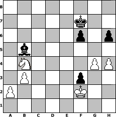 game notation in PGN-format [Event "Sommer Sonne Schach"] [Site "www.myChess.de"] [Date "2014.06.23"] [Round "1"] [White "borsti"] [Black "Mattheus"] [ECO "C42"] [WhitemyELO "1285"] [BlackmyELO "1142"] [Result "1-0"] [TimeControl "10/1728000"] [WhiteDays "79"] [BlackDays "69"] [MyChessNo "94936"] 1. e4 e5 2. Nf3 Nf6 3. Nc3 Nc6 4. Bb5 d6 5. d3 Be7 6. h3 Bd7 7. Be3 O-O 8. Bc4 a6 9. O-O b5 10. Bb3 Re8 11. Bd5 Nxd5 12. Nxd5 Bf6 13. Rc1 Nd4 14. Bxd4 exd4 15. Re1 a5 16. c4 b4 17. b3 c6 18. Nxf6+ Qxf6 19. Re2 d5 20. cxd5 cxd5 21. Rc5 Qg6 22. Kh2 dxe4 23. dxe4 Rxe4 24. Rxe4 Qxe4 25. Qxd4 Qxd4 26. Nxd4 h6 27. g4 g5 28. Kg3 Rd8 29. Rxa5 Rf8 30. Ra7 Bc8 31. Nc6 Re8 32. Ra8 Bd7 33. Rxe8+ Bxe8 34. Nxb4 f6 35. f4 Bb5 36. Nd5 Kf7 37. h4 gxf4+ 38. Kf2 f3 39. Nb4 1-0 position notation in FEN-format 8/5k2/5p1p/1b6/1N4PP/1P3p2/P4K2/8 - - - 1 39 Captured white pieces: ![]() ![]() ![]() ![]() ![]() ![]() ![]() ![]() ![]() ![]() ![]() ![]() ![]() ![]() ![]() Captured black pieces: ![]() ![]() ![]() ![]() ![]() ![]() ![]() ![]() ![]() ![]() ![]() ![]() ![]() ![]() ![]() Click on a captured piece in order to display the desired move!