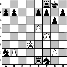game notation in PGN-format [Event "5. Wikinger-Meisterschaft, Vorrunde A"] [Site "www.myChess.de"] [Date "2009.03.23"] [Round "1"] [White "Hobbykegler"] [Black "Grubengeist"] [ECO "B07"] [WhitemyELO "1044"] [BlackmyELO "1938"] [Result "0-1"] [TimeControl "10/2592000"] [WhiteDays "82"] [BlackDays "90"] [MyChessNo "54169"] 1. e4 d6 2. Nc3 c5 3. d4 cxd4 4. Qxd4 Nc6 5. Qe3 g6 6. Bd2 Nf6 7. O-O-O Bg7 8. Qf4 Ng4 9. Nh3 Be5 10. Qf3 O-O 11. Bc4 Bd7 12. Rhe1 Nxh2 13. Qd3 Rc8 14. f4 Nb4 15. Qe3 Bxc3 16. Bxc3 Rxc4 17. e5 Nxa2+ 18. Kd2 dxe5 19. fxe5 Bb5+ 20. Ke2 Rxc3+ 21. Rd3 Rxc2+ 22. Kd1 Qxd3+ 23. Qxd3 Bxd3 24. Nf4 Rc1+ 25. Kd2 Nf1+ 26. Kxd3 Rxe1 0-1 position notation in FEN-format 5rk1/pp2pp1p/6p1/4P3/5N2/3K4/nP4P1/4rn2 - - - 0 27 Captured white pieces: ![]() ![]() ![]() ![]() ![]() ![]() ![]() ![]() ![]() ![]() ![]() ![]() ![]() ![]() ![]() Captured black pieces: ![]() ![]() ![]() ![]() ![]() ![]() ![]() ![]() ![]() ![]() ![]() ![]() ![]() ![]() ![]() Click on a captured piece in order to display the desired move!
