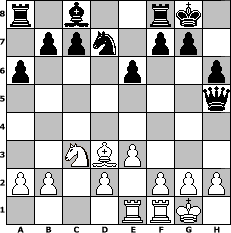 game notation in PGN-format [Event "Wargames -kill the King"] [Site "www.myChess.de"] [Date "2005.04.03"] [Round "2"] [White "Falcor"] [Black "Caligula"] [ECO "D23"] [WhitemyELO "1449"] [BlackmyELO "1457"] [Result "0-1"] [TimeControl "10/1728000"] [WhiteDays "19"] [BlackDays "20"] [MyChessNo "11731"] 1. d4 d5 2. c4 dxc4 3. Nf3 Nf6 4. Bg5 e6 5. Nc3 Be7 6. e3 O-O 7. Bxc4 h6 8. Bh4 a6 9. O-O Nc6 10. Ne5 Nxe5 11. dxe5 Nd7 12. Bxe7 Qxe7 13. Qh5 Qc5 14. Bd3 Qxe5 15. Rae1 Qxh5 0-1 position notation in FEN-format r1b2rk1/1ppn1pp1/p3p2p/7q/8/2NBP3/PP1P1PPP/4RRK1 - - - 0 16 Captured white pieces: Captured black pieces: Click on a captured piece in order to display the desired move!