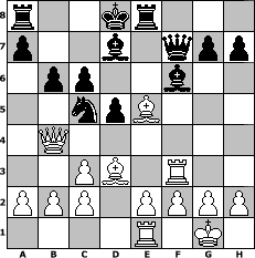 game notation in PGN-format [Event "Martins Weinprobe Open"] [Site "www.myChess.de"] [Date "2010.10.19"] [Round "1"] [White "Chaos"] [Black "deepsabel"] [ECO "C55"] [WhitemyELO "1719"] [BlackmyELO "2011"] [Result "0-1"] [TimeControl "10/1728000"] [WhiteDays "20"] [BlackDays "20"] [MyChessNo "69169"] 1. e4 e5 2. Nf3 Nc6 3. Bc4 Nf6 4. O-O Nxe4 5. Nc3 Nxc3 6. dxc3 f6 7. Qd5 Qe7 8. Re1 Nd8 9. Nxe5 c6 10. Qd4 fxe5 11. Rxe5 Ne6 12. Qg4 Qf6 13. Rf5 Qg6 14. Qf3 Be7 15. Bd3 Bf6 16. Bf4 d5 17. Bd6 Qf7 18. Re1 Bd7 19. Qg4 Kd8 20. Qb4 b6 21. Be5 Nc5 22. Rf3 Re8 0-1 position notation in FEN-format r2kr3/p2b1qpp/1pp2b2/2npB3/1Q6/2PB1R2/PPP1PPPP/4R1K1 - - - 4 23 Captured white pieces: Captured black pieces: Click on a captured piece in order to display the desired move!