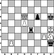 game notation in PGN-format [Event "Bobby`s Idee"] [Site "www.myChess.de"] [Date "2013.06.15"] [Round "1"] [White "Lemmi11"] [Black "Peterlie77 (C)"] [Variant "Fischerrandom"] [SetUp "1"] [FEN "bqnbnrkr/pppppppp/8/8/8/8/PPPPPPPP/BQNBNRKR w KQkq - 0 1"] [WhitemyELO "1864"] [BlackmyELO "2018"] [Result "0-1"] [TimeControl "10/2592000"] [WhiteDays "125"] [BlackDays "134"] [MyChessNo "88789"] 1. b4 b5 2. Nb3 Nb6 3. Bd4 d6 4. f4 Nd5 5. c3 a5 6. e4 Nxf4 7. Rxf4 e5 8. Rf5 exd4 9. Nxd4 c5 10. bxc5 g6 11. Rf2 dxc5 12. Qxb5 Qc8 13. Nb3 c4 14. Nxa5 Nd6 15. Qb4 Nxe4 16. Re2 Qc7 17. Nxc4 Be7 18. Qb5 Bc5+ 19. d4 Rb8 20. Qa5 Bxd4+ 21. cxd4 Qxc4 22. Qe5 O-O 23. Rxe4 Bxe4 24. Bb3 Qc6 25. O-O Rb5 26. Qf4 Rf5 27. Qe3 Rxf1+ 28. Kxf1 Re8 29. Qd2 Bd5 30. Bxd5 Qxd5 31. a4 Ra8 32. Nf3 Rxa4 33. Qe3 Qb5+ 34. Kf2 Ra2+ 35. Kg3 Re2 36. Qc3 h5 37. Qc8+ Kg7 38. Qc3 Qb8+ 39. Ne5 Qb1 40. Nf3 h4+ 41. Kxh4 Qf1 42. d5+ f6 43. Qc7+ Kh6 44. Qd6 g5+ 45. Nxg5 Qf2+ 46. g3 Qxh2+ 47. Nh3 Re4+ 0-1 position notation in FEN-format 8/8/3Q1p1k/3P4/4r2K/6PN/1P5q/8 - - - 2 48 Captured white pieces: Captured black pieces: Click on a captured piece in order to display the desired move!