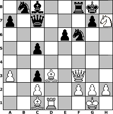 game notation in PGN-format [Event "RDK nun 1111 Tage alt"] [Site "www.myChess.de"] [Date "2007.11.23"] [Round "1"] [White "BirdofPray1"] [Black "Naunhofer"] [ECO "C18"] [WhitemyELO "2223"] [BlackmyELO "1665"] [Result "1-0"] [TimeControl "10/1728000"] [WhiteDays "16"] [BlackDays "19"] [MyChessNo "39999"] 1. e4 e6 2. d4 d5 3. Nc3 Bb4 4. e5 c5 5. a3 Bxc3+ 6. bxc3 Nc6 7. Nf3 Nge7 8. Be2 O-O 9. O-O f6 10. exf6 Rxf6 11. dxc5 Qa5 12. c4 dxc4 13. Nd2 c3 14. Ne4 Rf8 15. Qd3 Nd5 16. Rb1 b6 17. Rd1 bxc5 18. Ng5 Nf6 19. Qf3 Rb8 20. Rxb8 Nxb8 21. Bd3 Qc7 22. Nxh7 1-0 position notation in FEN-format 1nb2rk1/p1q3pN/4pn2/2p5/8/P1pB1Q2/2P2PPP/2BR2K1 - - - 0 22 Captured white pieces: ![]() ![]() ![]() ![]() ![]() ![]() ![]() ![]() ![]() ![]() ![]() ![]() ![]() ![]() ![]() Captured black pieces: ![]() ![]() ![]() ![]() ![]() ![]() ![]() ![]() ![]() ![]() ![]() ![]() ![]() ![]() ![]() Click on a captured piece in order to display the desired move!