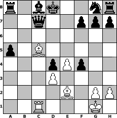 game notation in PGN-format [Event "Turnier f"] [Site "www.myChess.de"] [Date "2008.08.21"] [Round "1"] [White "stierdame1965"] [Black "commander"] [ECO "B01"] [WhitemyELO "968"] [BlackmyELO "1185"] [Result "0-1"] [TimeControl "10/2592000"] [WhiteDays "78"] [BlackDays "71"] [MyChessNo "47275"] 1. e4 d5 2. d3 d4 3. c3 c5 4. b4 b6 5. Bf4 Nc6 6. cxd4 Nxd4 7. bxc5 bxc5 8. Nf3 Qb6 9. Nc3 Qb2 10. Nd5 Kd7 11. Rb1 Qxa2 12. Nc3 Qa5 13. Ra1 Qxc3+ 14. Bd2 Qb2 15. Rb1 Qa3 16. Nxd4 cxd4 17. Qb3 Qa6 18. Be2 Kd8 19. Qc4 Qa3 20. Rb3 Qa1+ 21. Qc1 Qa4 22. Rb4 Qd7 23. O-O e5 24. Qc5 Bxc5 25. f4 Bxb4 26. Bxb4 a5 27. Bc5 Qc7 28. Rc1 exf4 0-1 position notation in FEN-format r1bk2nr/2q2ppp/8/p1B5/3pPp2/3P4/4B1PP/2R3K1 - - - 0 29 Captured white pieces: ![]() ![]() ![]() ![]() ![]() ![]() ![]() ![]() ![]() ![]() ![]() ![]() ![]() ![]() ![]() Captured black pieces: ![]() ![]() ![]() ![]() ![]() ![]() ![]() ![]() ![]() ![]() ![]() ![]() ![]() ![]() ![]() Click on a captured piece in order to display the desired move!