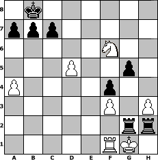 game notation in PGN-format [Event "April 2018"] [Site "www.myChess.de"] [Date "2018.04.11"] [Round "1"] [White "wolni55"] [Black "Steffi"] [ECO "C24"] [WhitemyELO "1415"] [BlackmyELO "1557"] [Result "0-1"] [TimeControl "10/1728000"] [WhiteDays "68"] [BlackDays "82"] [MyChessNo "111980"] 1. e4 e5 2. Bc4 Nf6 3. d3 d5 4. exd5 Nxd5 5. Qh5 Be6 6. Qxe5 Nc6 7. Qg3 Ncb4 8. Bb3 Qe7 9. Ne2 O-O-O 10. a3 Nc6 11. h3 h6 12. Bd2 Rg8 13. Bxh6 f6 14. Bd2 Bf7 15. Nbc3 Nxc3 16. Bxc3 Bxb3 17. cxb3 Re8 18. Qg4+ Kb8 19. Rd1 g6 20. Rd2 Bh6 21. Rc2 f5 22. Qf3 Qe6 23. O-O Qxb3 24. Rcc1 Bxc1 25. Rxc1 Qf7 26. Nf4 g5 27. Nh5 Ne5 28. Bxe5 Rxe5 29. Ng3 Rge8 30. a4 Qb3 31. d4 Qxf3 32. gxf3 f4 33. Nh5 Re2 34. d5 Rxb2 35. Nf6 Ree2 36. Ng4 Red2 37. Nf6 Rxf2 38. Rf1 Rg2+ 39. Kh1 Rh2+ 40. Kg1 Rbg2# 0-1 position notation in FEN-format 1k6/ppp5/5N2/3P2p1/P4p2/5P1P/6rr/5RK1 - - - 6 41 Captured white pieces: ![]() ![]() ![]() ![]() ![]() ![]() ![]() ![]() ![]() ![]() ![]() ![]() ![]() ![]() ![]() Captured black pieces: ![]() ![]() ![]() ![]() ![]() ![]() ![]() ![]() ![]() ![]() ![]() ![]() ![]() ![]() ![]() Click on a captured piece in order to display the desired move!