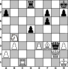 game notation in PGN-format [Event "^^Lust, Laune und Spannung am Schach!!!^^"] [Site "www.myChess.de"] [Date "2007.09.24"] [Round "1"] [White "Naunhofer"] [Black "bernhard"] [ECO "D37"] [WhitemyELO "1646"] [BlackmyELO "1605"] [Result "1-0"] [TimeControl "10/864000"] [WhiteDays "30"] [BlackDays "26"] [MyChessNo "38425"] 1. d4 d5 2. c4 e6 3. Nc3 Nf6 4. Nf3 Be7 5. e3 O-O 6. Be2 c5 7. cxd5 exd5 8. O-O b6 9. Ne5 Bb7 10. Bf3 Nc6 11. Nxc6 Bxc6 12. b3 Bd6 13. h3 Re8 14. Bb2 b5 15. dxc5 Bxc5 16. Ne2 b4 17. Qc2 Qd6 18. Bxf6 gxf6 19. Rac1 Bxe3 20. fxe3 Rac8 21. Qd2 Rcd8 22. Nd4 Bd7 23. Nc2 Re5 24. Nxb4 Bxh3 25. gxh3 Rg5+ 26. Kh1 Rg3 27. Rg1 Kh8 28. Rxg3 Qxg3 29. Qg2 1-0 position notation in FEN-format 3r3k/p4p1p/5p2/3p4/1N6/1P2PBqP/P5Q1/2R4K - - - 1 29 Captured white pieces: Captured black pieces: Click on a captured piece in order to display the desired move!