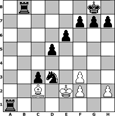 game notation in PGN-format [Event "wie w"] [Site "www.myChess.de"] [Date "2013.11.16"] [Round "1"] [White "Wulfen49"] [Black "Robur"] [ECO "B02"] [WhitemyELO "1356"] [BlackmyELO "1806"] [Result "0-1"] [TimeControl "10/1728000"] [WhiteDays "20"] [BlackDays "20"] [MyChessNo "91136"] 1. e4 Nf6 2. Nc3 d5 3. e5 Nfd7 4. d4 e6 5. Nf3 c5 6. Bg5 Qb6 7. b3 Nc6 8. Na4 Qa5+ 9. Bd2 Qc7 10. dxc5 Ncxe5 11. b4 Nxf3+ 12. Qxf3 Qe5+ 13. Be2 Qxa1+ 14. Bd1 Qxa2 15. Nc3 Qb2 16. Ne2 a5 17. Bc3 Qa3 18. O-O axb4 19. Bd4 Qxf3 20. gxf3 Bxc5 21. Be3 O-O 22. c3 bxc3 23. Bc2 b5 24. Bxc5 Nxc5 25. Nd4 Ba6 26. Nc6 b4 27. Nxb4 Bxf1 28. Kxf1 Ra1+ 29. Ke2 Rb8 30. Nd3 Nxd3 0-1 position notation in FEN-format 1r4k1/5ppp/4p3/3p4/8/2pn1P2/2B1KP1P/r7 - - - 0 31 Captured white pieces: Captured black pieces: Click on a captured piece in order to display the desired move!