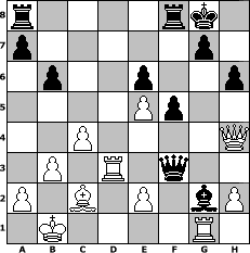 game notation in PGN-format [Event "Sizillianisches Schaltjahr Champions-Turnier"] [Site "www.myChess.de"] [Date "2004.02.29"] [Round "2"] [White "nordlicht"] [Black "torsten64"] [ECO "B65"] [WhitemyELO "1913"] [BlackmyELO "1796"] [Result "1-0"] [TimeControl "10/3456000"] [WhiteDays "84"] [BlackDays "81"] [MyChessNo "2703"] 1. e4 c5 2. Nf3 d6 3. d4 cxd4 4. Nxd4 Nf6 5. Nc3 Nc6 6. Bg5 e6 7. Qd2 Be7 8. O-O-O O-O 9. f4 Nxd4 10. Qxd4 Qa5 11. Qf2 b6 12. Qg3 Bb7 13. e5 dxe5 14. fxe5 Nh5 15. Qg4 Bxg5+ 16. Qxg5 Nf6 17. Rd4 Ne4 18. Nxe4 Qe1+ 19. Rd1 Qxe4 20. Bd3 Qa4 21. Kb1 Bd5 22. b3 Qc6 23. Qh4 h6 24. c4 Bxg2 25. Rhg1 Qf3 26. Bc2 f5 27. Rd3 1-0 position notation in FEN-format r4rk1/p5p1/1p2p2p/4Pp2/2P4Q/1P1R1q2/P1B1P1bP/1K4R1 - - - 1 27 Captured white pieces: Captured black pieces: Click on a captured piece in order to display the desired move!
