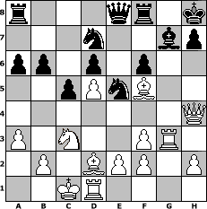 game notation in PGN-format [Event "Wanderpokal August 2006"] [Site "www.myChess.de"] [Date "2006.08.05"] [Round "1"] [White "torsten64"] [Black "hermtz"] [ECO "E12"] [WhitemyELO "2029"] [BlackmyELO "1775"] [Result "1-0"] [TimeControl "10/86400"] [WhiteDays "02"] [BlackDays "02"] [MyChessNo "27457"] 1. d4 Nf6 2. c4 e6 3. Nf3 b6 4. a3 Bb7 5. Nc3 Bxf3 6. gxf3 c5 7. d5 exd5 8. cxd5 d6 9. Rg1 g6 10. Bh3 Bg7 11. Qa4+ Nfd7 12. Bg5 f6 13. Bd2 O-O 14. Be6+ Kh8 15. Rxg6 Ne5 16. Rg3 a6 17. O-O-O Qe8 18. Qh4 Nbd7 19. Bf5 1-0 position notation in FEN-format r3qr1k/3n2bp/pp1p1p2/2pPnB2/7Q/P1N2PR1/1P1BPP1P/2KR4 - - - 5 19 Captured white pieces: Captured black pieces: Click on a captured piece in order to display the desired move!