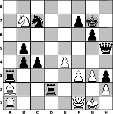 game notation in PGN-format [Event "Schach dem Nikolaus VI"] [Site "www.myChess.de"] [Date "2019.12.06"] [Round "1"] [White "Seneca"] [Black "Ziegert"] [ECO "A45"] [WhitemyELO "1458"] [BlackmyELO "1869"] [Result "0-1"] [TimeControl "10/2592000"] [WhiteDays "112"] [BlackDays "067"] [MyChessNo "116533"] 1. d4 Nf6 2. e3 g6 3. c4 Bg7 4. Nc3 O-O 5. Bd3 d6 6. Nge2 c5 7. d5 Na6 8. Ng3 e6 9. a3 Nc7 10. O-O exd5 11. cxd5 Nfxd5 12. Nxd5 Nxd5 13. Bc4 Nc7 14. Rb1 h5 15. b4 b5 16. Bb3 h4 17. Ne4 c4 18. Ba2 Bf5 19. Nxd6 Bd3 20. Nb7 Qd5 21. Nc5 Bxf1 22. Qxf1 a5 23. e4 Qh5 24. Bb2 Rfd8 25. Bxg7 Kxg7 26. f3 Rd2 27. Ra1 h3 28. g3 axb4 29. Nb7 Rxa3 0-1 position notation in FEN-format 8/1Nn2pk1/6p1/1p5q/1pp1P3/r4PPp/B2r3P/R4QK1 - - - 0 30 Captured white pieces: Captured black pieces: Click on a captured piece in order to display the desired move!