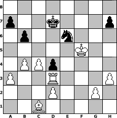 game notation in PGN-format [Event "Herbstman"] [Site "www.myChess.de"] [Date "2015.11.01"] [Round "1"] [White "reisinger"] [Black "Geisterreiter"] [ECO "D06"] [WhitemyELO "1428"] [BlackmyELO "1401"] [Result "1-0"] [TimeControl "10/2592000"] [WhiteDays "30"] [BlackDays "30"] [MyChessNo "101039"] 1. d4 d5 2. c4 Nf6 3. e3 b6 4. Nc3 Ba6 5. b3 e6 6. a3 Be7 7. Bd3 c5 8. Nf3 Ng4 9. h3 cxd4 10. exd4 Nxf2 11. Kxf2 Bf6 12. Re1 Bxd4+ 13. Nxd4 Qf6+ 14. Nf5 Qxc3 15. Nxg7+ Qxg7 16. Ra2 d4 17. Rae2 Bb7 18. Be4 Nc6 19. Bd5 O-O-O 20. Bf3 Rhg8 21. Re4 e5 22. Rg4 Qf8 23. Qd3 f5 24. Rxg8 e4 25. Rxf8 exd3 26. Rxd8+ Nxd8 27. Bxb7+ Nxb7 28. Rd1 Nc5 29. b4 Ne4+ 30. Kf3 Ng5+ 31. Kf4 Ne6+ 32. Kxf5 Kd7 33. Rxd3 1-0 position notation in FEN-format 8/p2k3p/1p2n3/5K2/1PPp4/P2R3P/3P2P1/2B5 - - - 0 33 Captured white pieces: Captured black pieces: Click on a captured piece in order to display the desired move!