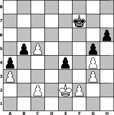 game notation in PGN-format [Event "Schach an Hl.Abend"] [Site "www.myChess.de"] [Date "2015.12.24"] [Round "1"] [White "Wernburger"] [Black "Helmut48"] [ECO "A22"] [WhitemyELO "1835"] [BlackmyELO "1959"] [Result "0-1"] [TimeControl "10/2592000"] [WhiteDays "30"] [BlackDays "30"] [MyChessNo "101839"] 1. c4 e5 2. Nc3 Nf6 3. Nf3 Nc6 4. g3 d5 5. cxd5 Nxd5 6. Bg2 Nb6 7. O-O Be7 8. d3 O-O 9. Be3 f5 10. Qc1 Kh8 11. Rd1 Be6 12. d4 e4 13. Ne5 Nb4 14. a3 N4d5 15. Bd2 Nxc3 16. Bxc3 Bb3 17. Rf1 Rc8 18. e3 c5 19. Qd2 Na4 20. Rac1 Be6 21. Rfd1 Nxc3 22. Rxc3 Qd5 23. Nd3 cxd4 24. Rxc8 Bxc8 25. Nf4 Qb3 26. Qxd4 Bf6 27. Qd6 Rg8 28. Bf1 Bxb2 29. Be2 a6 30. Qc7 g5 31. Nd5 Be6 32. Ne7 Rf8 33. Rd8 Rxd8 34. Qxd8+ Kg7 35. Qc7 Kh6 36. Qb8 Kg7 37. Qc7 Kh6 38. Qb8 Bg7 39. Qd6 Bf6 40. Nxf5+ Kg6 41. Nd4 Bxd4 42. exd4 Qd5 43. Qe7 Qd7 44. Qb4 b5 45. Qc5 Bd5 46. h3 Qc6 47. Qf8 h6 48. Bg4 Be6 49. Qc5 Qxc5 50. dxc5 Bxg4 51. hxg4 Kf7 52. Kf1 a5 53. Ke2 a4 0-1 position notation in FEN-format 8/5k2/7p/1pP3p1/p3p1P1/P5P1/2P1KP2/8 - - - 0 54 Captured white pieces: Captured black pieces: Click on a captured piece in order to display the desired move!