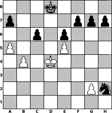 game notation in PGN-format [Event "^^Frohes neues Jahr^^"] [Site "www.myChess.de"] [Date "2007.12.29"] [Round "1"] [White "rux"] [Black "Andylein1989"] [ECO "A10"] [WhitemyELO "1394"] [BlackmyELO "1412"] [Result "0-1"] [TimeControl "10/864000"] [WhiteDays "40"] [BlackDays "37"] [MyChessNo "41106"] 1. c4 d5 2. cxd5 Qxd5 3. Nc3 Qd8 4. Nf3 Nf6 5. e3 Nc6 6. d4 Bf5 7. Bb5 Bd7 8. d5 Nb4 9. Ba4 Nbxd5 10. Nxd5 Nxd5 11. Ne5 Bxa4 12. Qxa4+ c6 13. Nxc6 Qd7 14. e4 Nb6 15. Qc2 Qxc6 16. Qxc6+ bxc6 17. Bf4 e6 18. O-O-O Bc5 19. Bd6 Bxd6 20. Rxd6 Rc8 21. b3 O-O 22. Kb1 Rfd8 23. Rhd1 Rxd6 24. Rxd6 Kf8 25. a4 Ke7 26. Rd4 Rd8 27. Rxd8 Kxd8 28. a5 Nd7 29. b4 Ne5 30. Kc2 Ng4 31. Kc3 Nxf2 32. e5 Ng4 33. Kd4 Nxh2 0-1 position notation in FEN-format 3k4/p4ppp/2p1p3/P3P3/1P1K4/8/6Pn/8 - - - 0 34 Captured white pieces: Captured black pieces: Click on a captured piece in order to display the desired move!