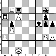 game notation in PGN-format [Event "Turnier zum Tag der deutschen Einheit"] [Site "www.myChess.de"] [Date "2010.10.04"] [Round "2"] [White "hape50"] [Black "Caligula"] [ECO "D00"] [WhitemyELO "1341"] [BlackmyELO "1374"] [Result "1-0"] [TimeControl "10/1728000"] [WhiteDays "118"] [BlackDays "118"] [MyChessNo "68791"] 1. d4 d5 2. h3 Nf6 3. Nf3 e6 4. e3 Nc6 5. Bb5 Bd7 6. a3 a6 7. Bd3 Bd6 8. Nc3 O-O 9. b4 e5 10. dxe5 Nxe5 11. Bb2 Nxd3+ 12. Qxd3 c6 13. Ng5 h6 14. Nf3 Qc8 15. Nd4 c5 16. Nf3 Be6 17. Ne2 c4 18. Qd2 Ne4 19. Qd4 f6 20. O-O Kh8 21. Nc3 Nxc3 22. Bxc3 Rf7 23. Qh4 Kh7 24. Nd4 Be5 25. f4 Bd6 26. f5 Bd7 27. Rf3 Be5 28. e4 Ba4 29. exd5 Qd7 30. Qe4 Rd8 31. Ne6 Bxc3 32. Rxc3 Qxd5 33. Qxc4 Qxc4 34. Rxc4 Re8 35. c3 Bb3 36. Re4 Bc2 37. Ng5+ fxg5 38. Rxe8 Bxf5 39. c4 Bd7 40. Rb8 b5 41. c5 Rf6 42. Rd8 Rf7 43. Rd1 Bc6 44. R1d6 Rc7 45. g3 g6 46. Kf2 Kg7 47. Ke3 Kf7 48. Rh8 Kg7 49. Rdd8 Re7+ 50. Kd2 h5 51. Rhg8+ Kh7 52. Rgf8 Be4 53. Rd6 Kg7 54. Rff6 Bf5 55. Rxa6 Rd7+ 56. Kc1 Rd3 57. Rfb6 Rd7 58. c6 Rc7 59. Rb7 1-0 position notation in FEN-format 8/1Rr3k1/R1P3p1/1p3bpp/1P6/P5PP/8/2K5 - - - 2 59 Captured white pieces: Captured black pieces: Click on a captured piece in order to display the desired move!