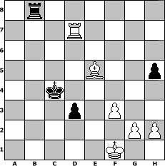 game notation in PGN-format [Event "Aprilturnier"] [Site "www.myChess.de"] [Date "2016.04.22"] [Round "1"] [White "faustballer"] [Black "Master1"] [ECO "B10"] [WhitemyELO "1503"] [BlackmyELO "1255"] [Result "1-0"] [TimeControl "10/1728000"] [WhiteDays "99"] [BlackDays "67"] [MyChessNo "103350"] 1. e4 c6 2. Nf3 d5 3. e5 Bf5 4. d4 Na6 5. a3 e6 6. Be2 c5 7. Bb5+ Ke7 8. Bxa6 Qa5+ 9. b4 Qxa6 10. dxc5 Qc4 11. c3 Bxb1 12. Rxb1 Qxc3+ 13. Qd2 Qxd2+ 14. Bxd2 h6 15. O-O Kd7 16. Nd4 Ne7 17. Nb5 Kc6 18. Nd6 f5 19. exf6 gxf6 20. Rfc1 a6 21. a4 Nc8 22. b5+ Kd7 23. Nxc8 Rxc8 24. Be3 axb5 25. axb5 e5 26. c6+ bxc6 27. bxc6+ Rxc6 28. Rxc6 Kxc6 29. Rb6+ Kc7 30. Rxf6 d4 31. Bd2 h5 32. f3 Bc5 33. Kf1 Be7 34. Rf7 Kd6 35. Bb4+ Kd5 36. Rxe7 Rb8 37. Be1 d3 38. Bg3 Kc4 39. Rc7+ Kd5 40. Rd7+ Kc4 41. Bxe5 1-0 position notation in FEN-format 1r6/3R4/8/4B2p/2k5/3p1P2/6PP/5K2 - - - 0 41 Captured white pieces: Captured black pieces: Click on a captured piece in order to display the desired move!