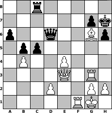 game notation in PGN-format [Event "9er5"] [Site "www.myChess.de"] [Date "2015.01.04"] [Round "1"] [White "Naunhofer"] [Black "Schachboy1"] [ECO "A46"] [WhitemyELO "1605"] [BlackmyELO "1299"] [Result "1-0"] [TimeControl "10/3456000"] [WhiteDays "40"] [BlackDays "37"] [MyChessNo "97438"] 1. d4 Nf6 2. Nf3 d6 3. c4 Nbd7 4. Nc3 e5 5. Bg5 Be7 6. d5 O-O 7. e4 Nc5 8. Bd3 Bg4 9. O-O c6 10. Bxf6 Bxf6 11. Bc2 Bxf3 12. Qxf3 a6 13. b4 Nd7 14. Qd3 c5 15. a3 cxb4 16. axb4 Rc8 17. Bb3 Re8 18. Na4 Nf8 19. f4 exf4 20. Rxf4 Bg5 21. Rg4 h6 22. Rf1 Nd7 23. Qe2 Ne5 24. Rg3 Ng6 25. Qf2 Rf8 26. Qb6 Qd7 27. Qd4 b5 28. Nb6 Be3+ 29. Qxe3 Qe7 30. Nxc8 Rxc8 31. c5 dxc5 32. d6 Qxd6 33. Bxf7+ Kh7 34. Bxg6+ 1-0 position notation in FEN-format 2r5/6pk/p2q2Bp/1pp5/1P2P3/4Q1R1/3P2PP/5RK1 - - - 0 34 Captured white pieces: Captured black pieces: Click on a captured piece in order to display the desired move!