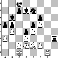 game notation in PGN-format [Event "Albspiele 30"] [Site "www.myChess.de"] [Date "2013.05.25"] [Round "1"] [White "borsti"] [Black "Knight"] [ECO "A02"] [WhitemyELO "1329"] [BlackmyELO "1196"] [Result "1/2-1/2"] [TimeControl "10/1728000"] [WhiteDays "20"] [BlackDays "20"] [MyChessNo "88446"] 1. f4 e5 2. d3 Nc6 3. e4 Nf6 4. f5 d5 5. Bg5 d4 6. Nf3 h6 7. Bxf6 Qxf6 8. a3 Bd7 9. Nbd2 O-O-O 10. g3 g5 11. g4 h5 12. Ng1 hxg4 13. Qxg4 Bc5 14. Ngf3 Ne7 15. Qxg5 Qxg5 16. Nxg5 Rdf8 17. O-O-O f6 18. Ne6 Bxe6 19. h3 Bd7 20. Rg1 Rfg8 21. Rh1 b5 22. b4 Bb6 23. Be2 a5 24. Rdg1 Rxg1+ 25. Rxg1 Rxh3 1/2-1/2 position notation in FEN-format 2k5/2pbn3/1b3p2/pp2pP2/1P1pP3/P2P3r/2PNBP2/2K3R1 - - - 0 26 Captured white pieces: Captured black pieces: Click on a captured piece in order to display the desired move!
