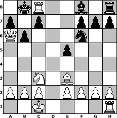 game notation in PGN-format [Event "Spanische Tortur"] [Site "www.myChess.de"] [Date "2009.02.08"] [Round "1"] [White "rakl"] [Black "sel"] [ECO "C62"] [WhitemyELO "1828"] [BlackmyELO "1383"] [Result "1-0"] [TimeControl "10/2592000"] [WhiteDays "60"] [BlackDays "60"] [MyChessNo "52500"] 1. e4 e5 2. Nf3 Nc6 3. Bb5 d6 4. d4 Bd7 5. Nc3 Nxd4 6. Bxd7+ Qxd7 7. Nxd4 exd4 8. Qxd4 Nf6 9. Be3 b6 10. O-O-O O-O-O 11. e5 dxe5 12. Qc4 Qe6 13. Qa6+ Kb8 14. Rxd8+ Qc8 15. Rxc8# 1-0 position notation in FEN-format 1kR2b1r/p1p2ppp/Qp3n2/4p3/8/2N1B3/PPP1PPPP/2K4R - - - 0 15 Captured white pieces: Captured black pieces: Click on a captured piece in order to display the desired move!